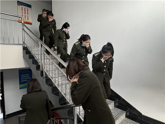 演练模拟巡检人员发现宿办楼2楼西侧女生宿舍因违规使用电器引起火灾,有浓烟雾飘出,立即上报值班站长,值班站长马上安排灭火组赶往现场灭火,并同时通知疏导组引导宿办楼职工有序、安全疏散。救援组及时将被浓烟困住的职工救出,并成功将火扑灭,整个演练过程紧张有序、配合默契,在短时间内迅速完成了灭火和疏散逃生工作。