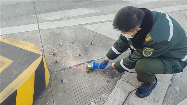 清理现场,三人分工协作、默契配合。副站长统筹指挥,明确作业区域与安全注意事项;并与机电员王乐一起使用专业工具对地钉残留部分进行拔除与打磨;当班班长负责现场安全警戒,引导过往车辆有序通行,避免作业期间发生安全隐患。