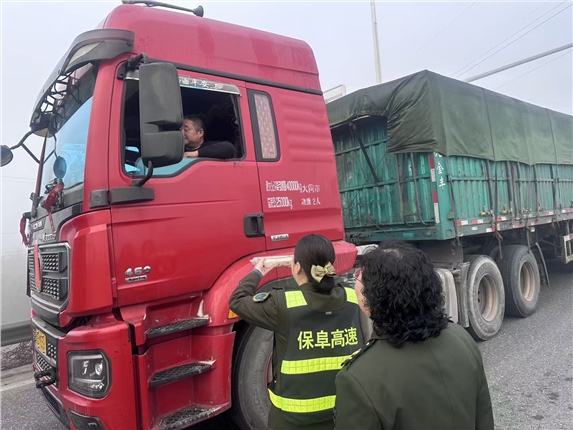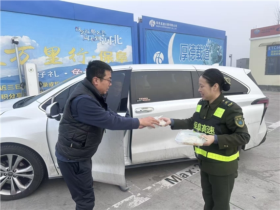 2026年3月15日,受大雾天气影响,保定西收费站保定方向临时关闭,部分车辆与司乘人员滞留站区。为保障司乘基本需求、缓解等待焦虑,值班站长陈亚朋快速响应、靠前指挥,立即组织员工张艳玲、安全员王洪娜组成临时服务小组,开展暖心便民服务。